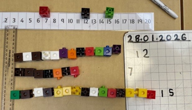 Fantastic maths work has been shown over this week, using concrete manipulatives. Counting out two numbers using cubes accurately, finding the smallest/greatest numbers. Ordering three numbers can be difficult if you are still learning to recognise your numbers to 20.  The little learning steps are so important. We moved on to adding a two digit to a one-digit number by counting our ones first, then adding our ten. Finally, we ended the week by beginning 'Doubles'... double 2 is 4 / double 7 is 7+7=14. We played double the number on the dice.