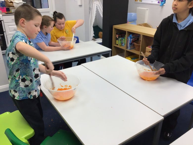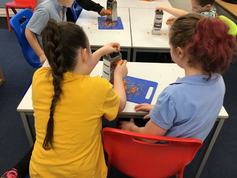 In cooking this week, we enjoyed making Carrot muffins! Lots of carrots to grate!
