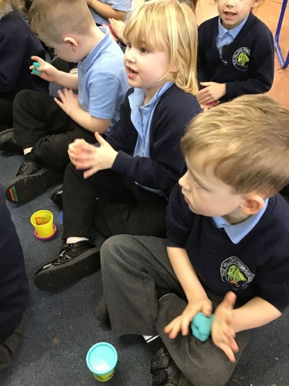 To help strengthen the muscles needed for writing, the children take part in Playdough Disco. This fun, energetic activity combines music with squeezing, rolling, pinching, and stretching playdough. These actions help build hand strength, finger control, and coordination — all essential foundations for confident mark-making and writing.