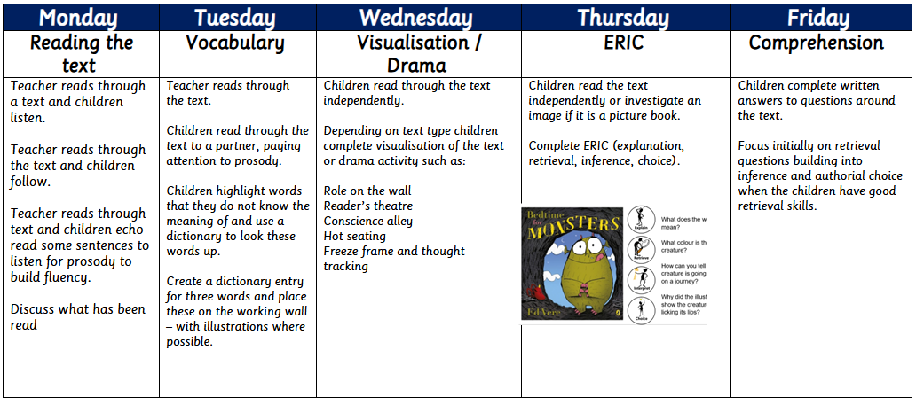 • In Key Stage 2 children participate in 45 minute guided reading session daily. The lessons are planned to explicitly teach the requirements of the National Curriculum 2014 for reading using fiction, non-fiction, poetry, illustrations and sometimes film clips. As part of the National Curriculum comprehension requirements studied include sequencing, retrieval, vocabulary, explanation, prediction and inference. See timetable below.